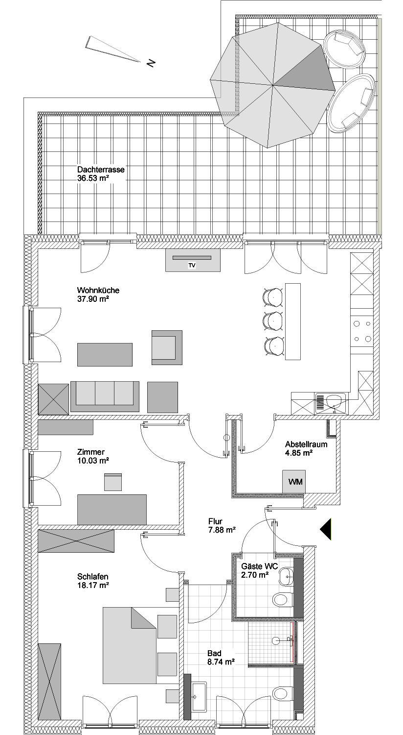 Dachterrasse 36,53 m² / 2= 18,27 m²
