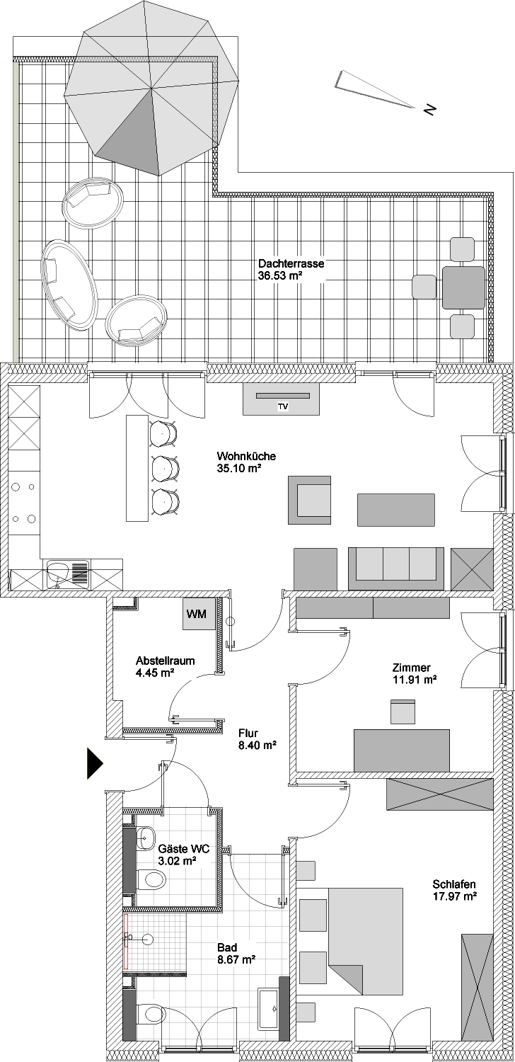 Dachterrasse | 36,53 m² / 2= 18,27 m² |